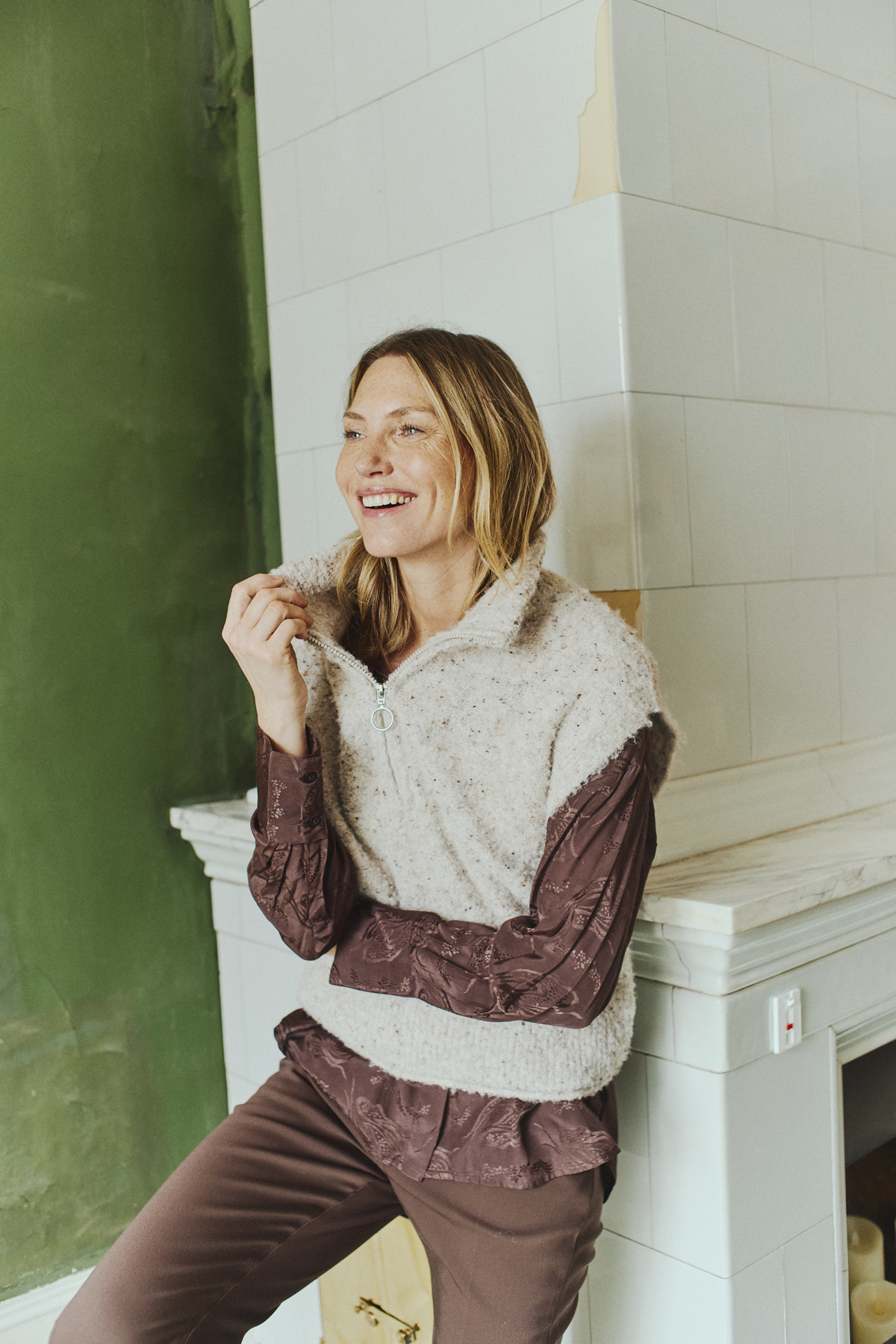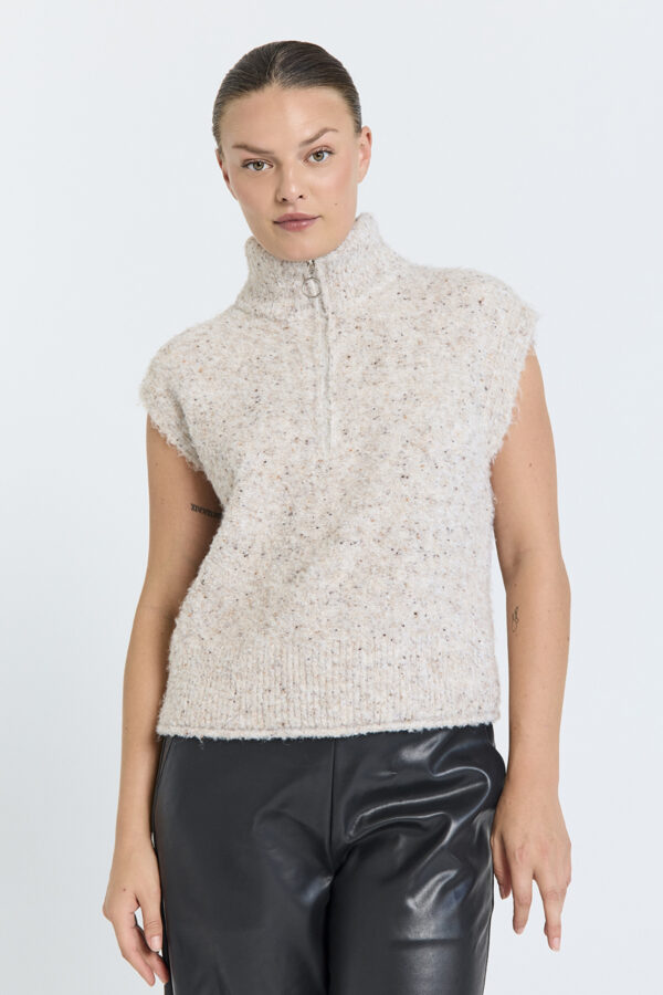 Den blødeste strik vest fra Freequent i en lækker lys beige farve. Vesten er enkel i modellen med en regulær pasform, høj krave, lynlåslukning, en løs pasform samt brede ribkanter. Perfekt til et lag-på-lag outfit med en langærmet t-shirt under.
