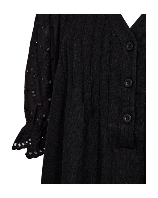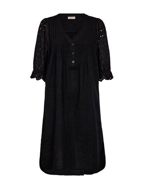 En feminin og luftig sommerkjole i en blød og behagelig hørblanding. Den sorte kjolen har et afslappet snit og fine detaljer, der giver et elegant og sofistikeret udtryk. De broderede ærmer med elastikmanchet tilføjer et romantisk touch, mens de lodrette læg og V-udskæringen skaber en flatterende silhuet. Et oplagt valg til både hverdag og særlige anledninger.