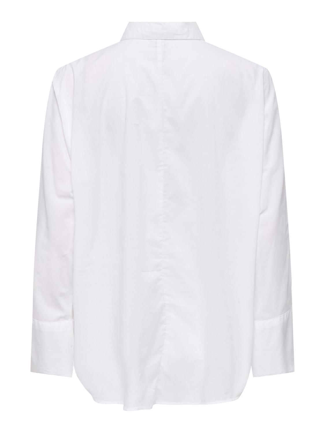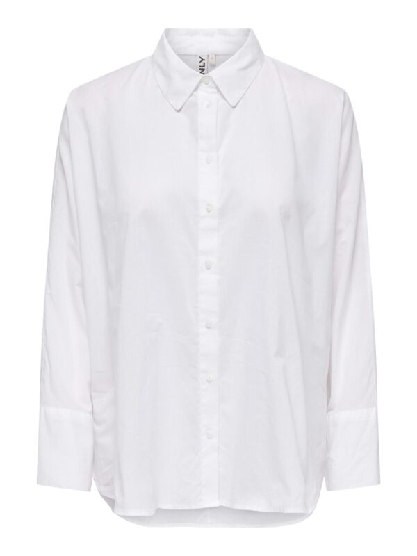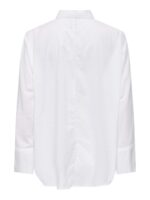 Klassisk hvid skjorte med krave, knaplukning foran og brede manchetter på ærmerne.