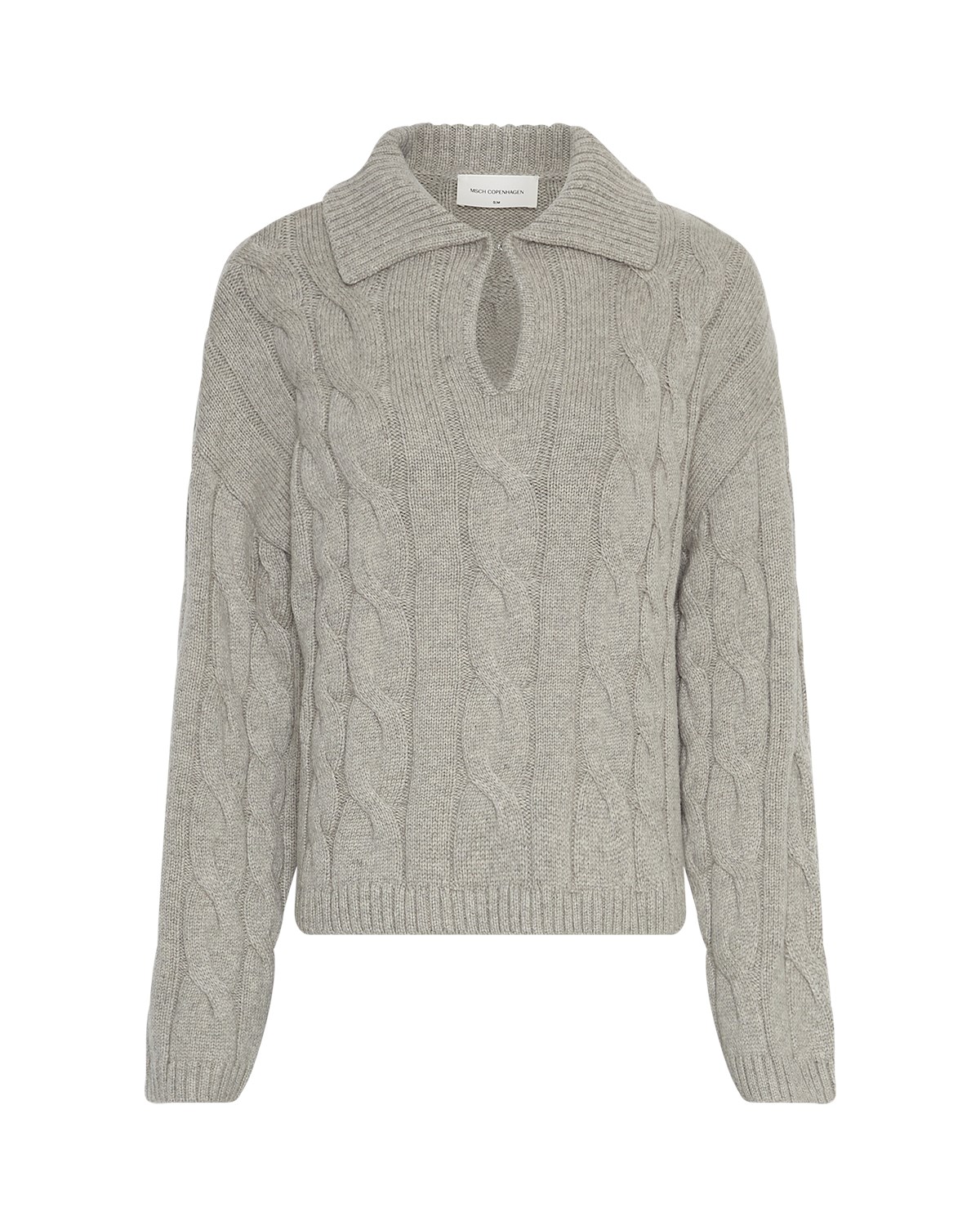 Beige striktrøje med et klassisk kabelmønster og en åben kraveudskæring. Strikkens strukturerede uldblanding giver et varmt og let udtryk, mens det klassiske kabelmønster tilfører tekstur og dybde. Pasformen er afslappet uden at være oversize, hvilket gør den velegnet til hverdag og afslappede looks – både til jeans, bukser og joggingbukser.
