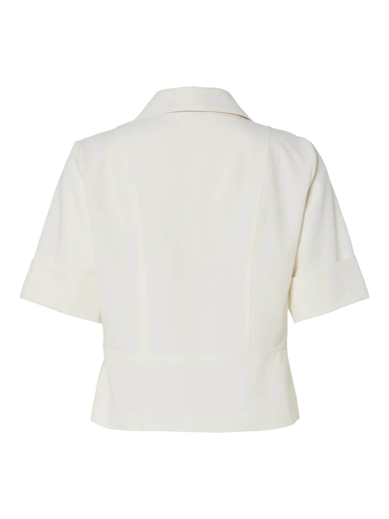 Den hvide topp er fremstillet i en vævet twill-kvalitet med en glat og let struktureret overflade, som falder flot og giver et elegant look. Den korte ærmelængde og V-udskæringen fremhæver det feminine snit, mens det let strækbare materiale sikrer komfort hele dagen.