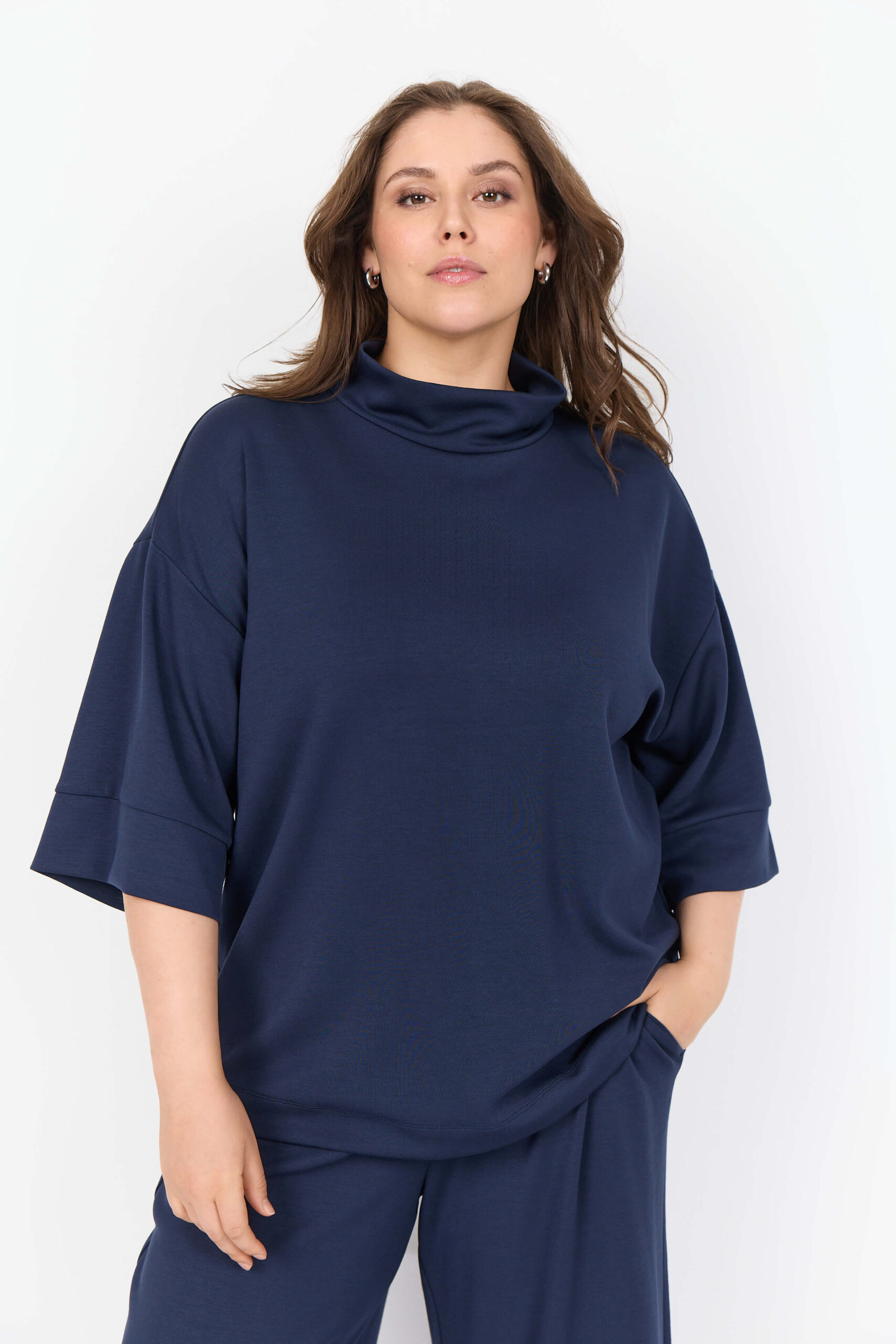 Den blå bluse fra Wasabi er en stilfuld og afslappet tilføjelse til din basisgarderobe. Blusen er fremstillet i en blød og strækbar kvalitet, der kombinerer komfort med et moderne snit. Den har en høj mock neck og brede 3/4-lange ærmer, der skaber en afslappet silhuet med et elegant udtryk. Brug den blå bluse med slanke jeans for et afslappet hverdagslook, eller style med en nederdel for et mere sofistikeret udtryk.