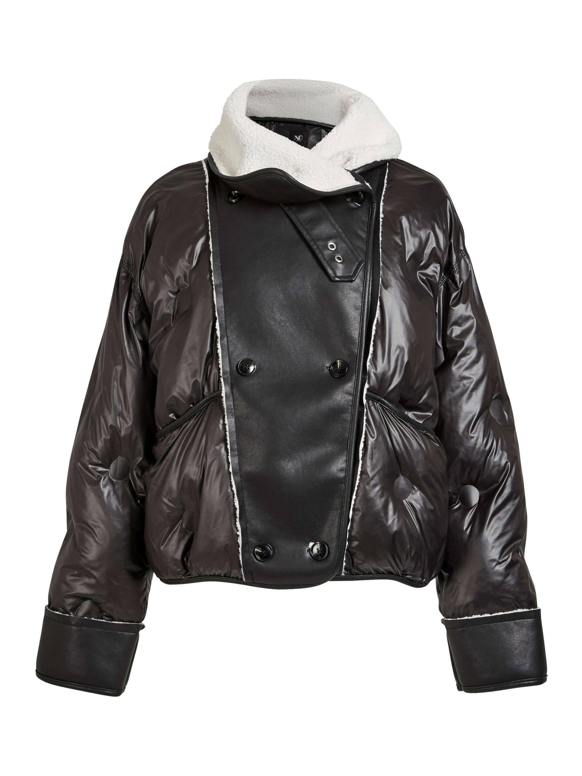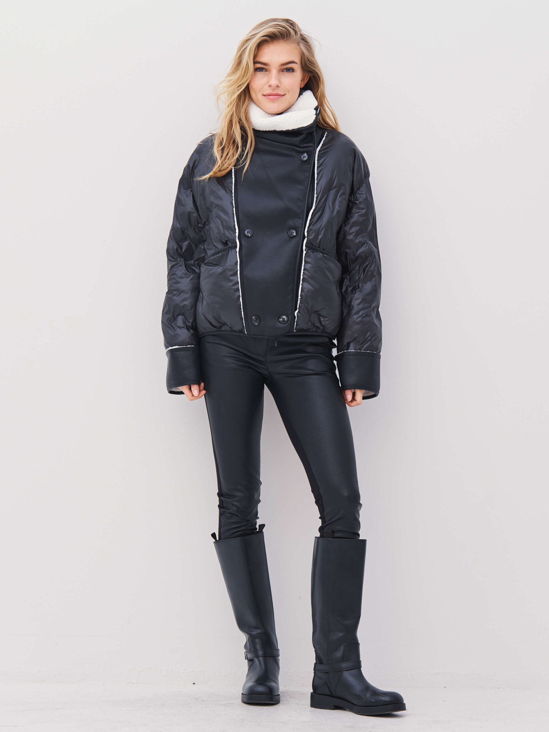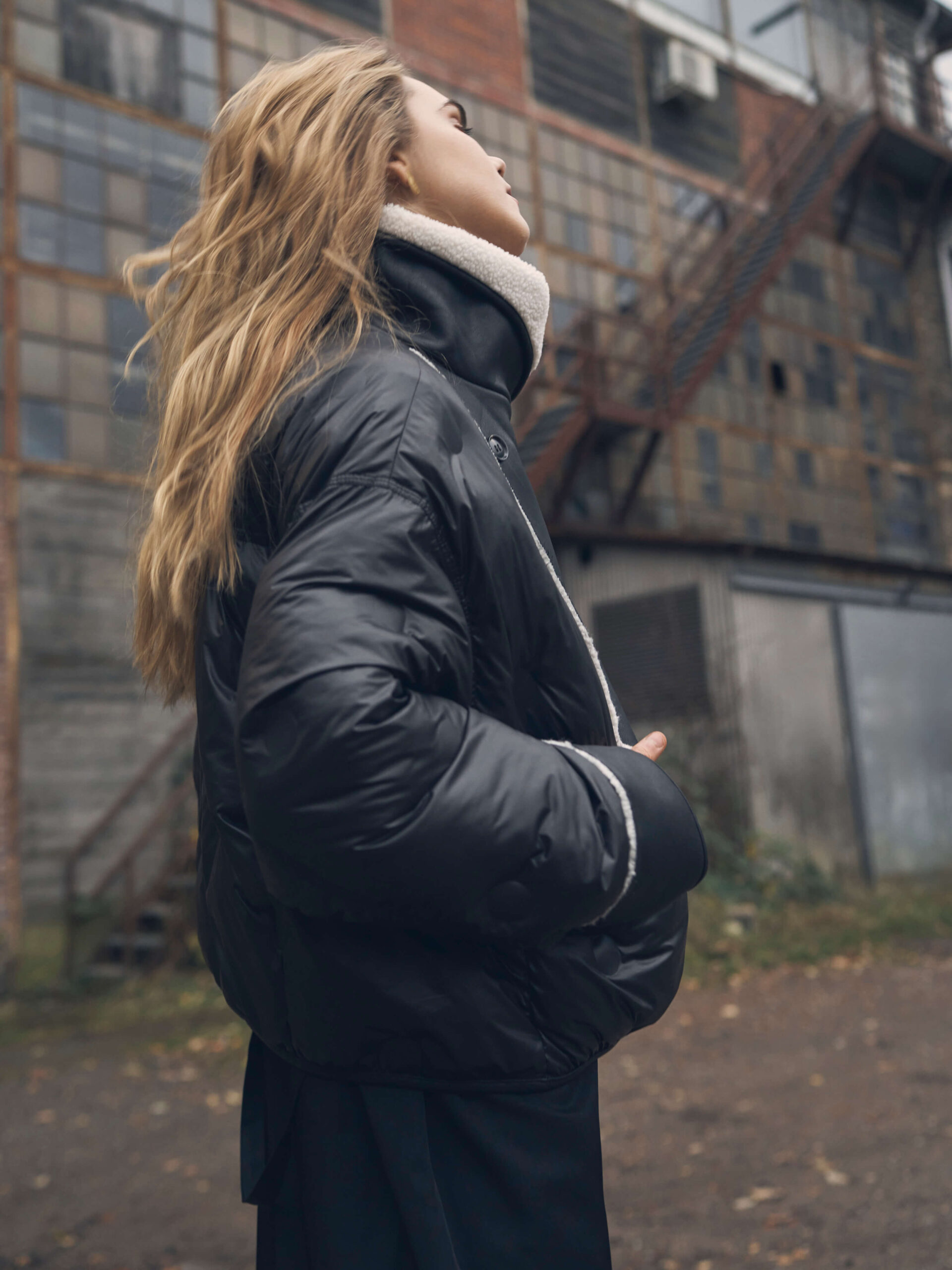 Den sorte jakke fra NÜ er et markant og stilfuldt statement piece til årets koldere måneder. Med sin eksklusive blanding af materialer og sit eksperimenterende design kombinerer den funktionalitet med edgy elegance. Den blanke overflade og den høje, teddyforede krave giver jakken et moderne og urbant udtryk, mens den korte, boxy pasform og de brede manchetter tilføjer ekstra karakter. Perfekt til dig, der ønsker en sort jakke, som både varmer og skiller sig ud.