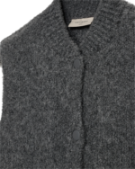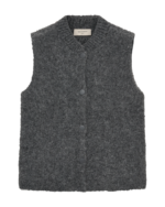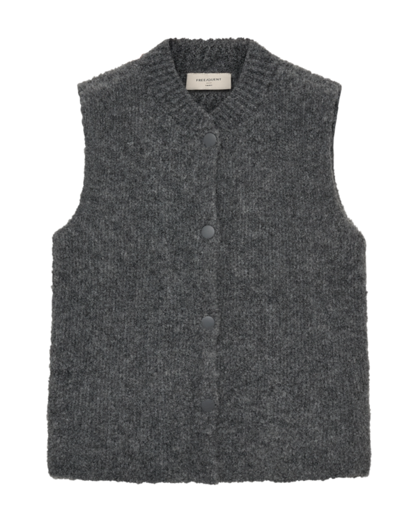 Grå vest fra Freequent i en blød, strikket kvalitet. Vesten er enkel i modellen med knaplukning på fronten samt en rund halsudskæring med ribkant. En dejlig varm strik vest til et lag-på-lag look med en skjorte eller langærmet t-shirt under.