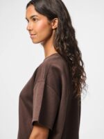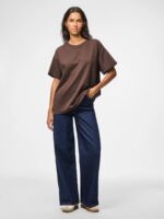 En afslappet og cool basic t-shirt fra PIECES i en smuk, dyb brun nuance kaldet Hot Fudge. Den har et oversized fit med korte ærmer og rund hals, hvilket giver et moderne og casual udtryk, der er perfekt til både hverdag og weekend.