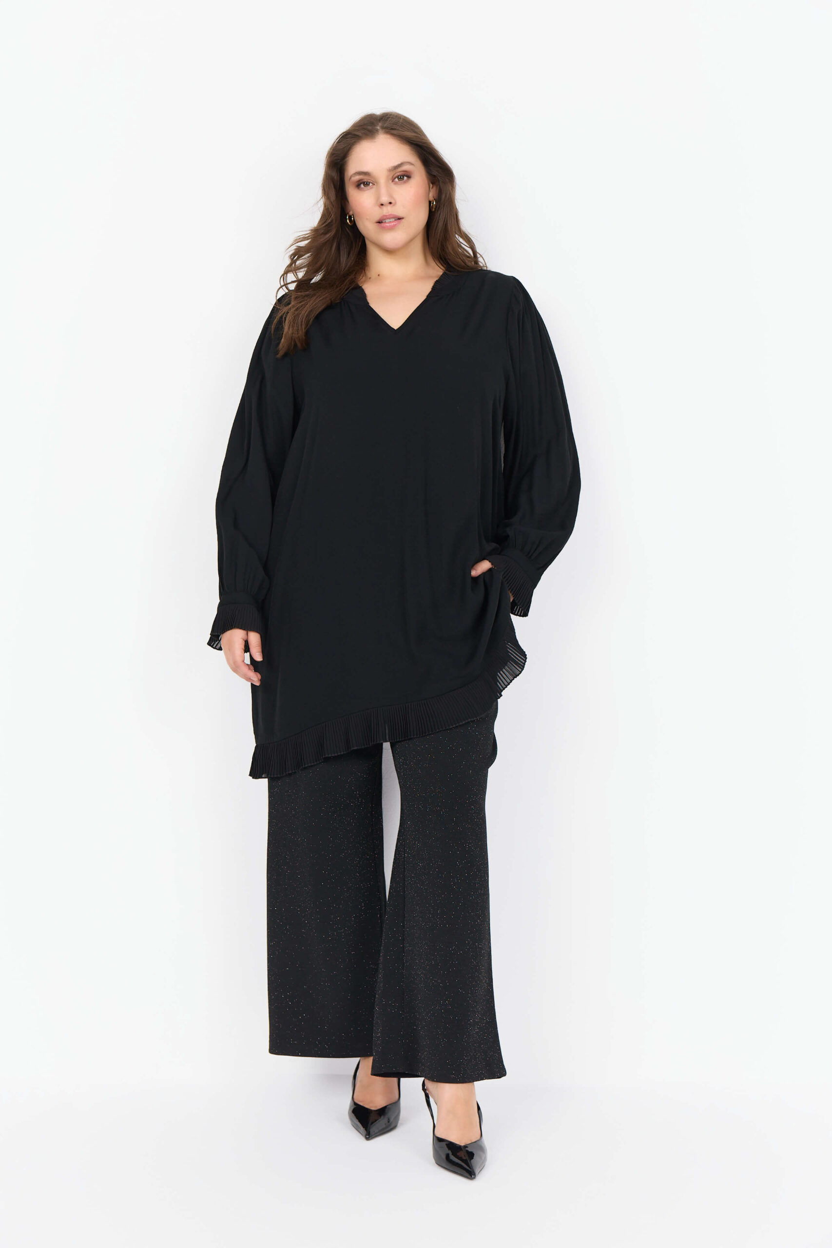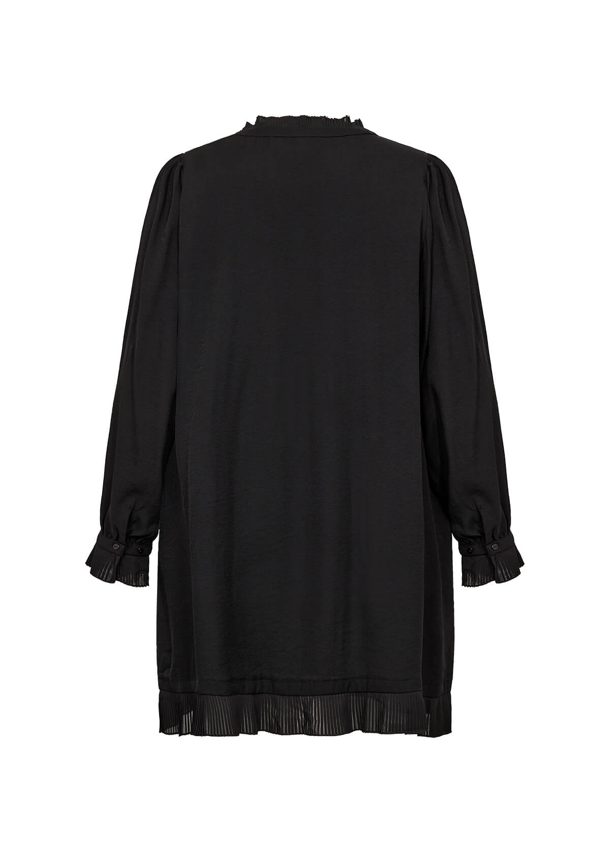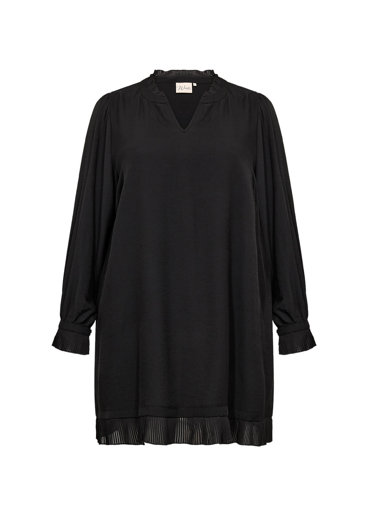 Den sorte tunika fra Wasabi er en elegant og tidløs tunika med fine detaljer, der giver et feminint og eksklusivt udtryk. Den har en smuk V-udskæring med flæsedetaljer, lange ærmer med plisserede manchetter og en plisseret kant forneden, som tilfører et let og sofistikeret fald. Den sorte tunika er skabt i en blød og komfortabel LENZING™ ECOVERO™-viskoseblanding, der gør den ideel både til hverdag og fest. Style kjolen med leggings eller strømpebukser for et cool og elegant outfit.
