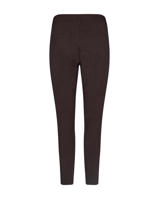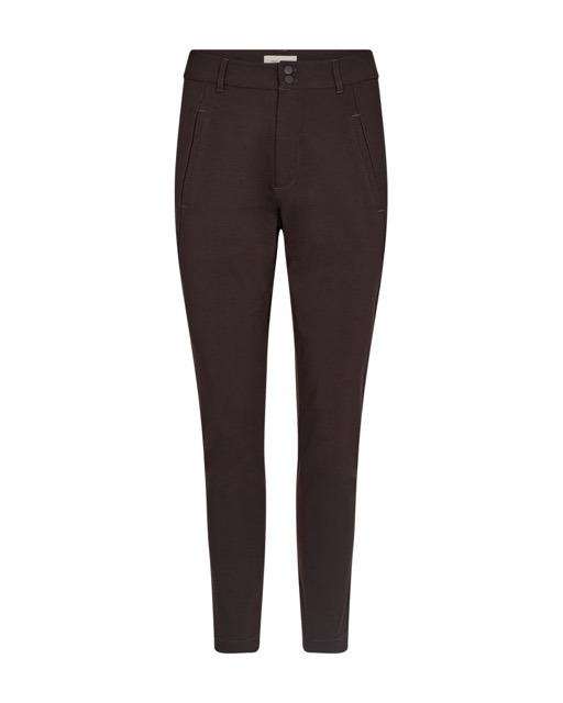 Brune bukser fra Freequent i en stretchy kvalitet. Bukserne er enkle i modellen med sidelommer, antydningen af baglommer, knap- og lynlåslukning på fronten, synlige syningsdetaljer samt en tætsiddende pasform.