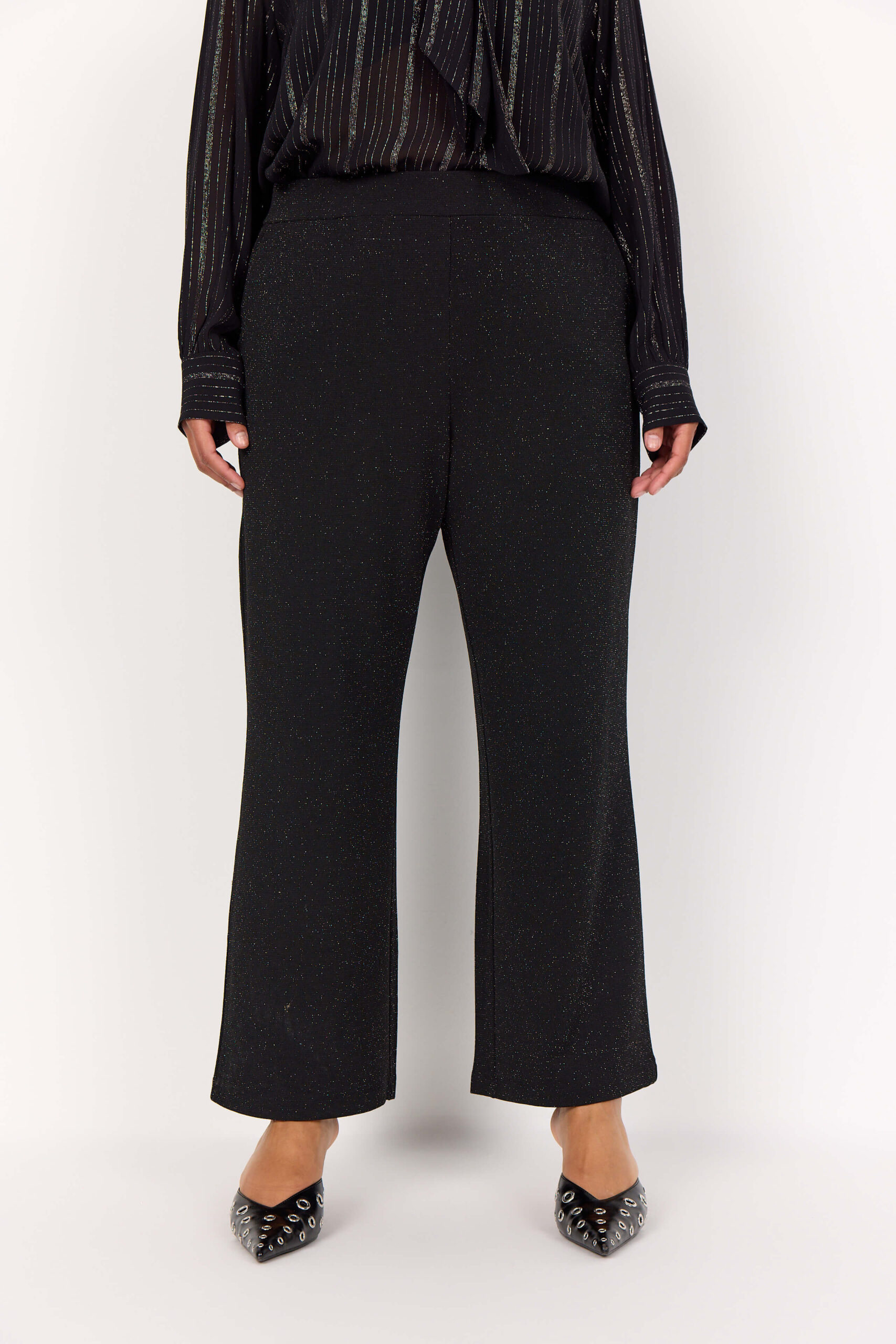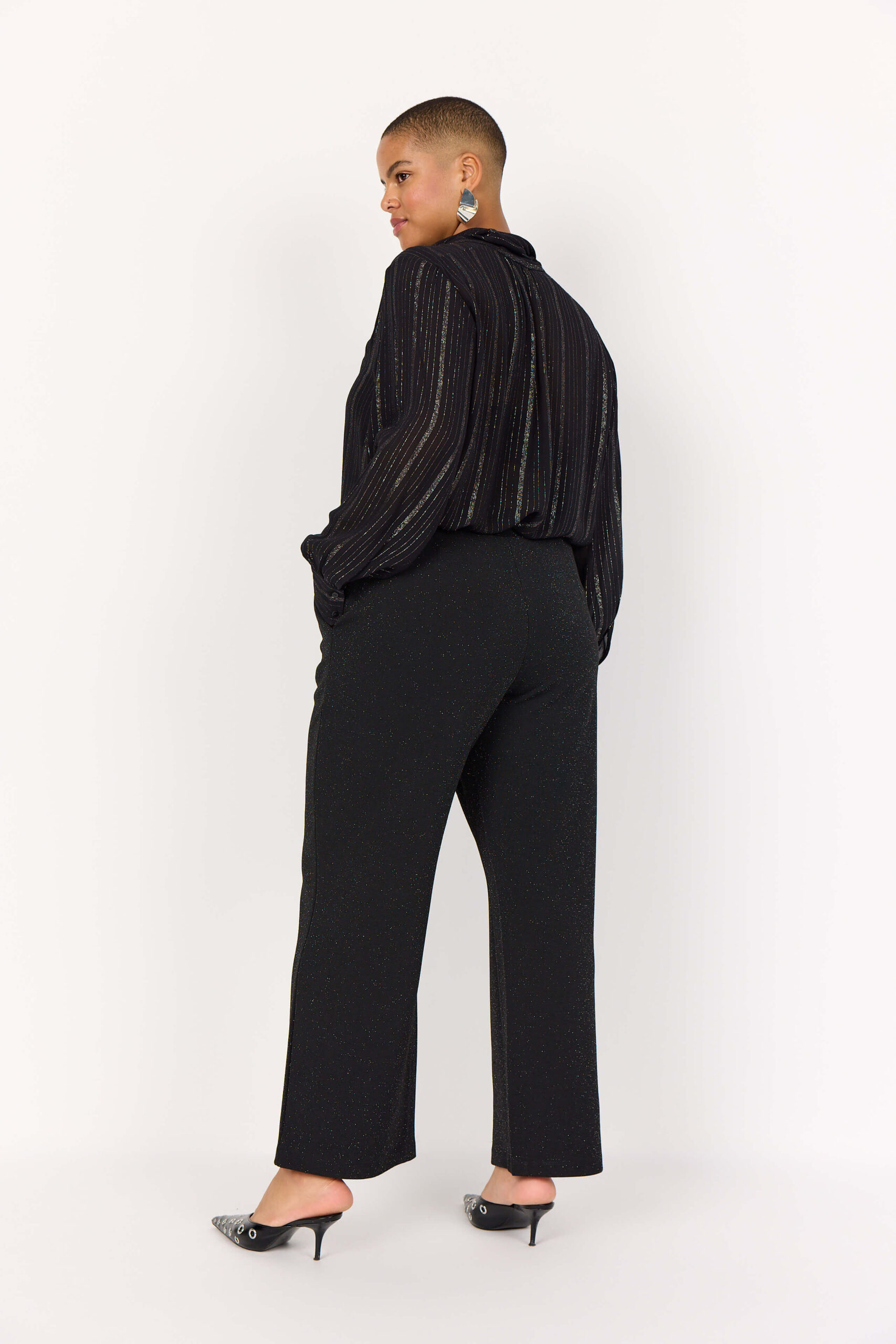Med WA-SANJA 5 får du et par glitrende sorte bukser fra Wasabi, der har et sofistikeret og moderne udtryk. Bukserne har en midterhøj talje og lige ben, hvilket gør dem perfekte både til festlige lejligheder og hverdagsbrug. Det bløde materiale med stræk sikrer god komfort og pasform hele dagen. Style de glitrende sorte bukser med en elegant skjorte eller matchende blazer for et gennemført look.
