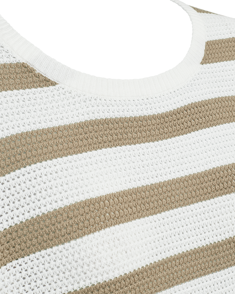 Afslappet og stilren strik med brede striber i en smuk kombination af offwhite og sandfarvede nuancer. Strikken har en klassisk rund hals, lange ærmer og en løs pasform, der giver et moderne og komfortabelt look. Den lette struktur i strikken giver et casual udtryk, som er perfekt til hverdagen.