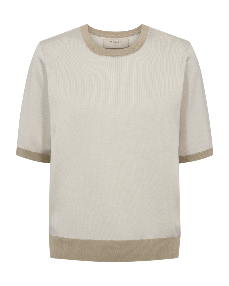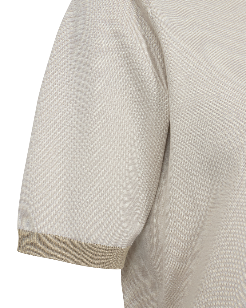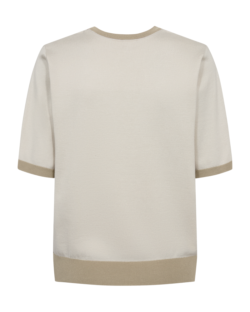 Elegant og enkel strikbluse i en smuk lys nuance med fine kontrastkanter ved hals, ærmer og bund. Den korte ærmelængde og den lette kvalitet giver et feminint og stilrent udtryk, som gør blusen perfekt til både hverdag og mere pæne anledninger.