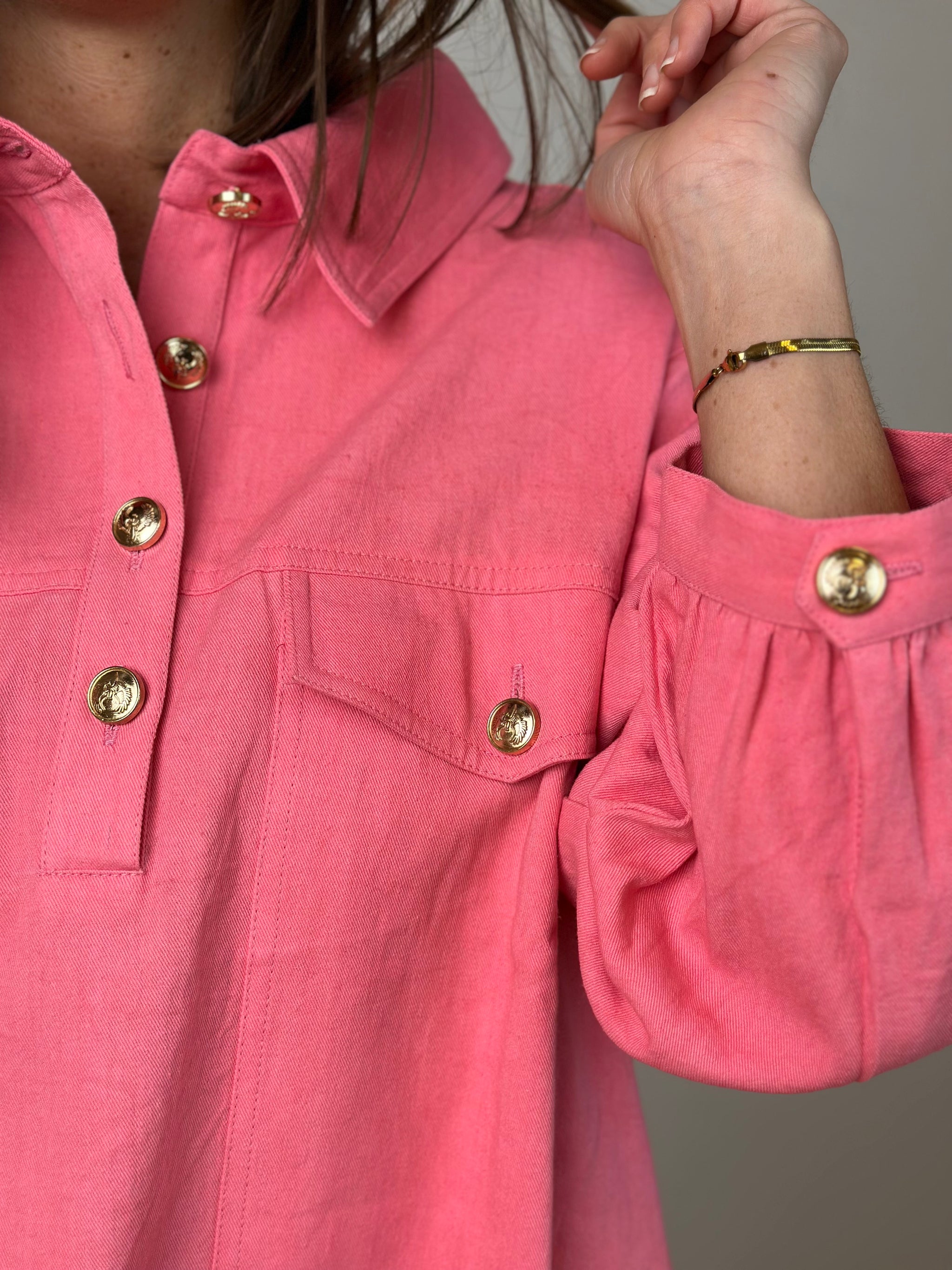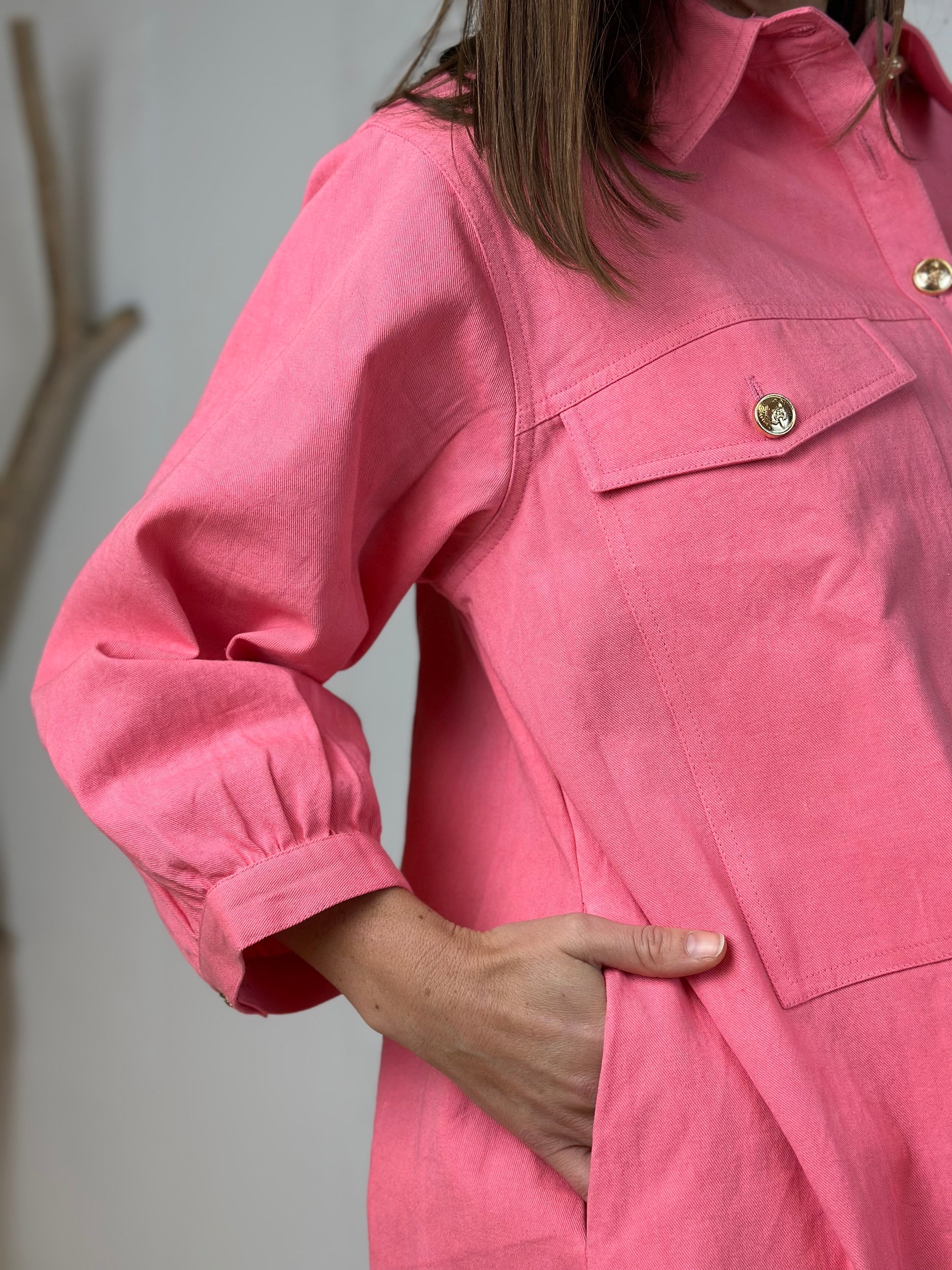 Derudover har kjolen lommer i siderne, stolpelukning foran med elegante guldknapper, samt et større guldlogobroderi på ryggen, der tilfører et eksklusivt touch.