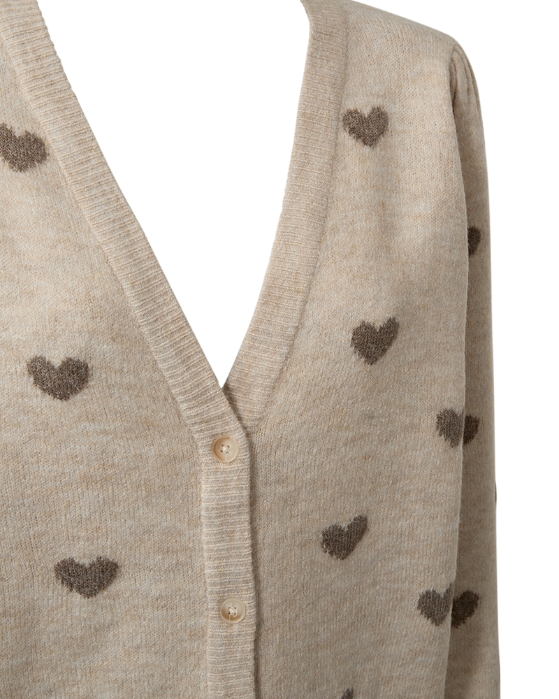 Cardigan fra Freequent i en blød, strikket kvalitet med et fint hjertemønster. Cardiganen har lange pufærmer, V-udskæring, hornknapper på fronten, en løs pasform samt ribkanter med en kontraststribe, der giver en flot effekt.