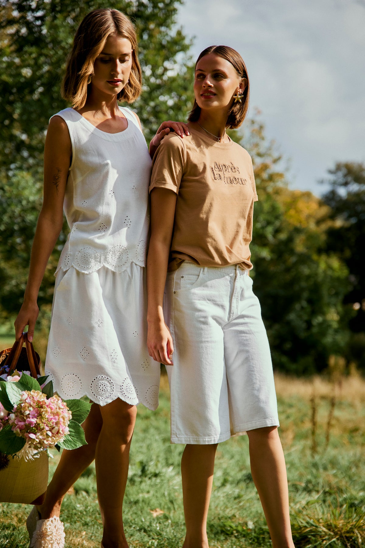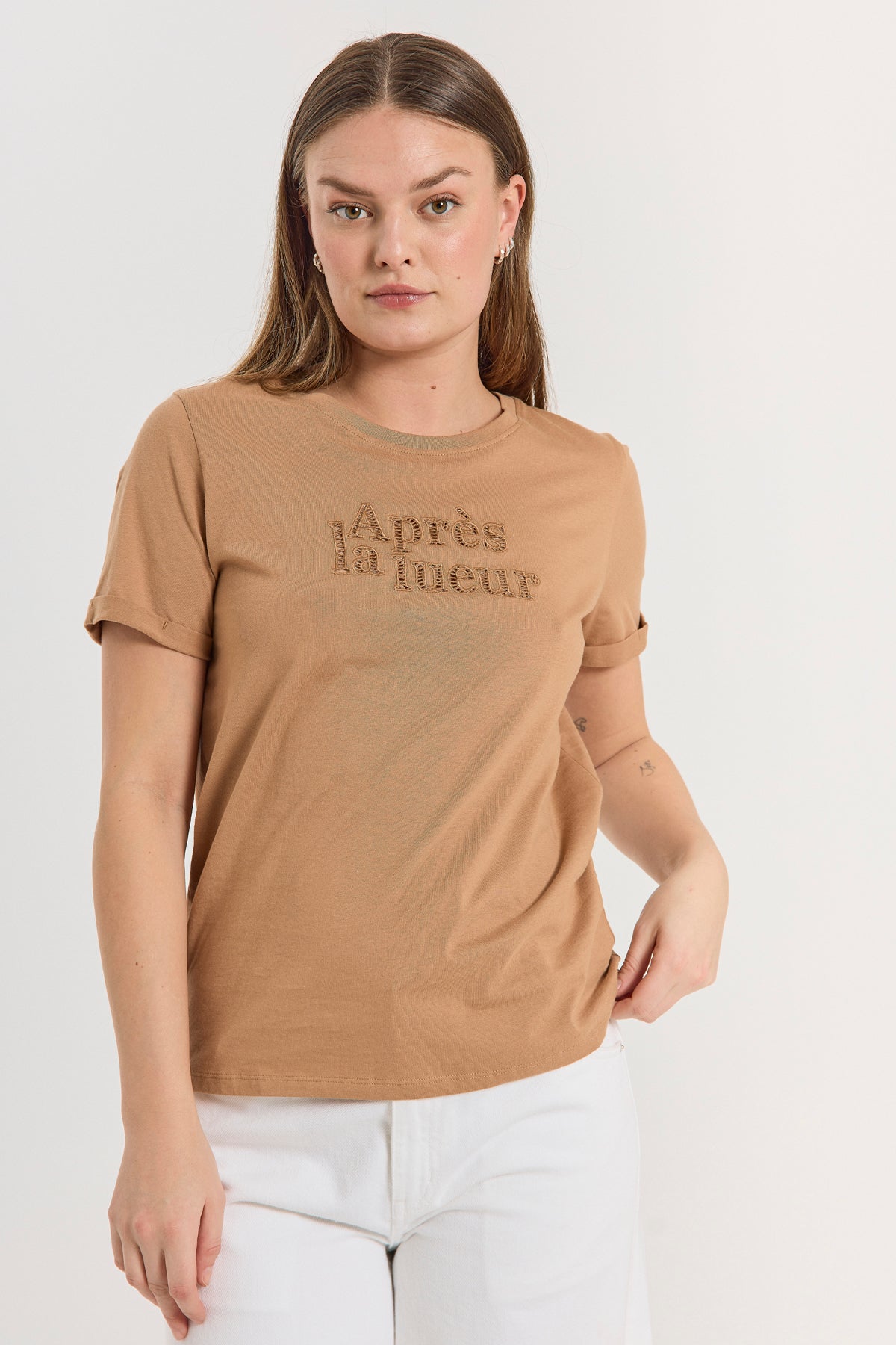 T-shirt fra Freequent i en blød kvalitet. T-shirten er enkel i modellen med rib i den runde halsudskæring, korte ærmer med opsmøg, en broderet detalje på fronten samt en elegant, løs pasform.
