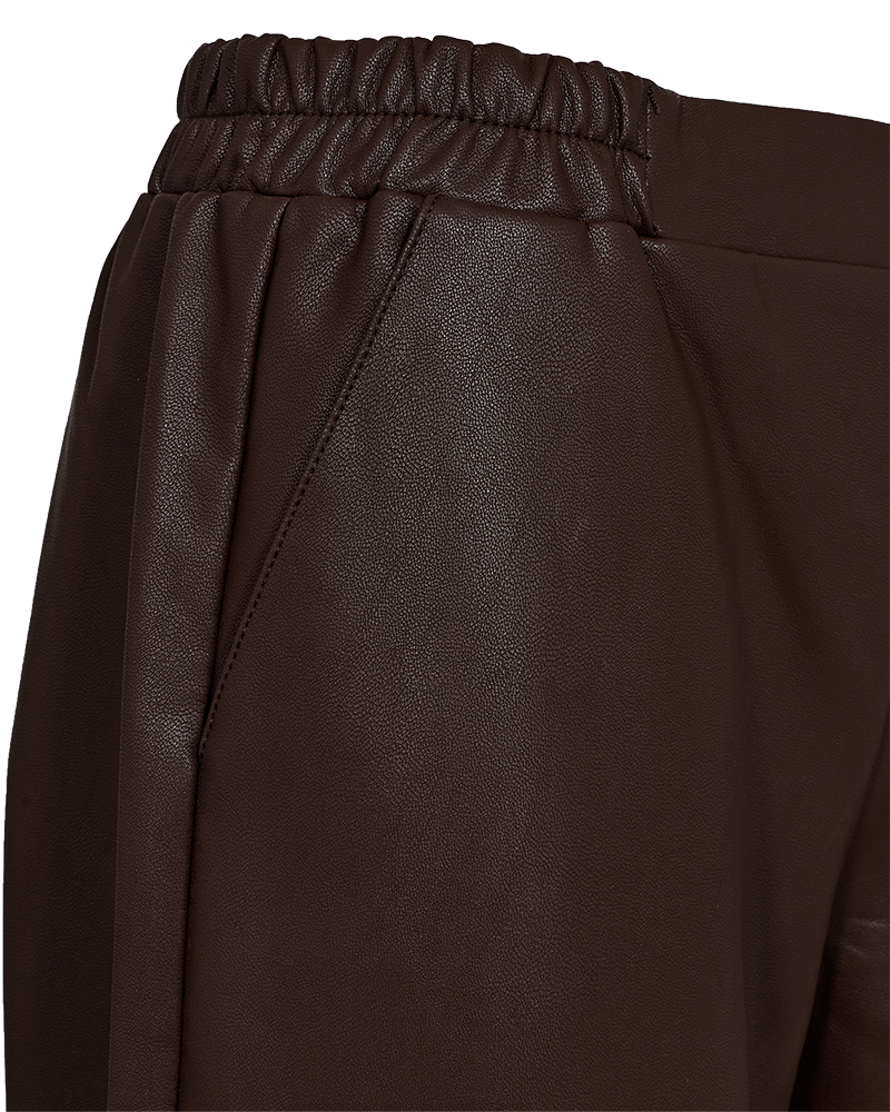 Bukser fra Freequent i en lækker kvalitet af imiteret læder. Bukserne er enkle i modellen med vide ben, syningsdetalje på knæerne, for- og baglommer samt elastik i taljen.
