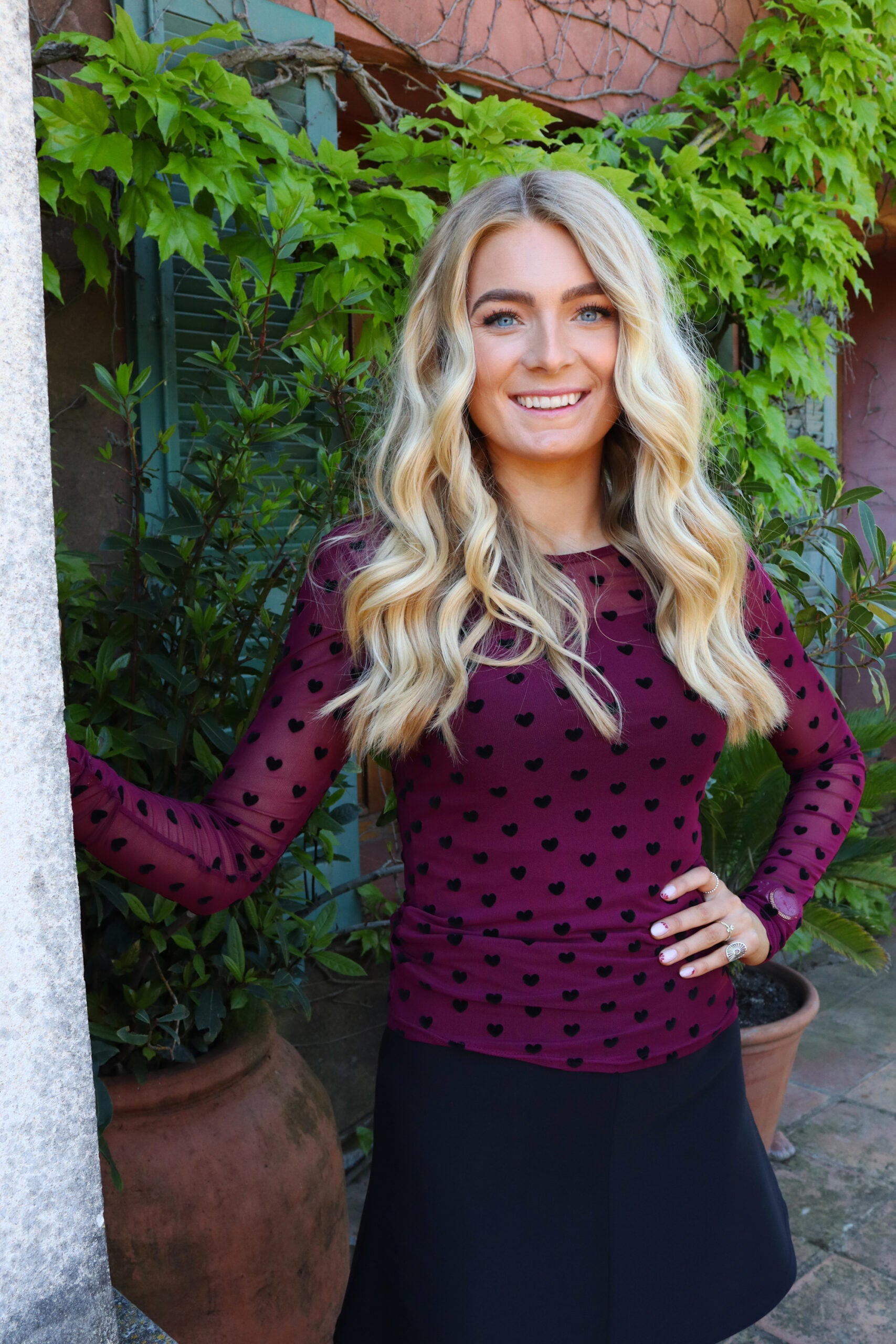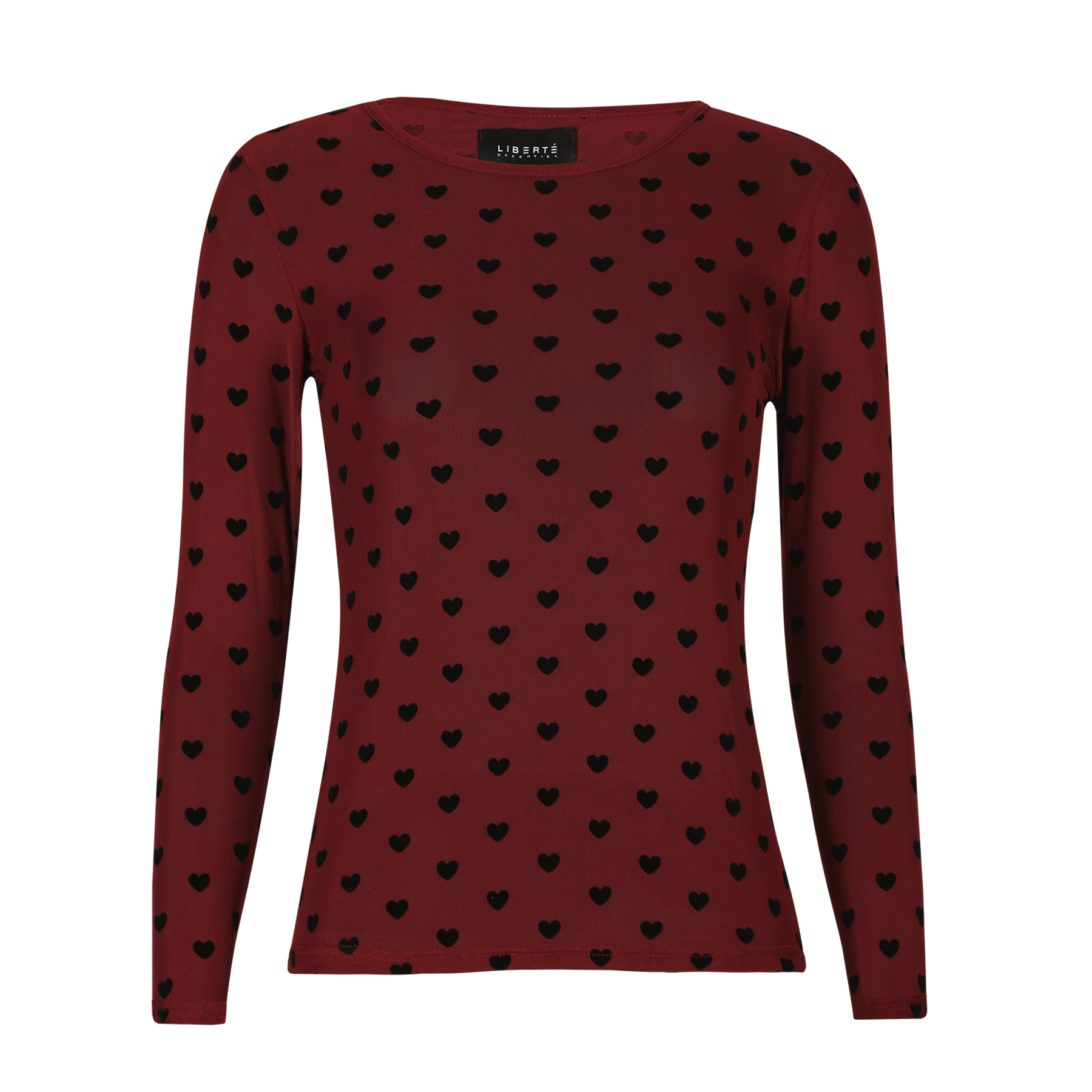 Sød langærmet t-shirt i mesh i den fineste bordeaux røde farve. Den er transparant med små sorte hjerter fordelt over hele blusen.