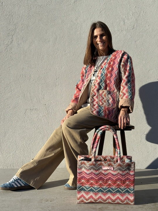 Marseille Jacket er en karakterfuld jakke med et markant, vævet mønster og et afslappet, tidløst snit. Jakken har en lige, let boxy silhuet, som giver et moderne udtryk og gør den velegnet som både overgangsjakke og indendørs lag. De lange ærmer er afsluttet med kontrastfarvede manchetter, som kan foldes op og tilfører en fin, afslappet detalje. Designet er kendetegnet ved de påsatte forlommer og den gennemgående stolpelukning med dekorative knapper, der understreger det håndværksmæssige præg. På ryggen er jakken udsmykket med et diskret broderi, som giver et eksklusivt og gennemtænkt finish. Marseille Jacket er fremstillet i et smukt vævet tekstil med tydelig struktur og fås i to forskellige farvevarianter – én i klassisk sort/creme og én i en mere farverig udgave med varme rosa- og blåtoner. En alsidig jakke, der tilfører både personlighed og tekstur til garderoben. Kvalitet 100% Bomuld MÅL: Brystmål str. S/M: 114 cm Længde str. S/M 70 Cm Brystmål str. L/XL: 122 cm Længde str. L/XL 72 Cm