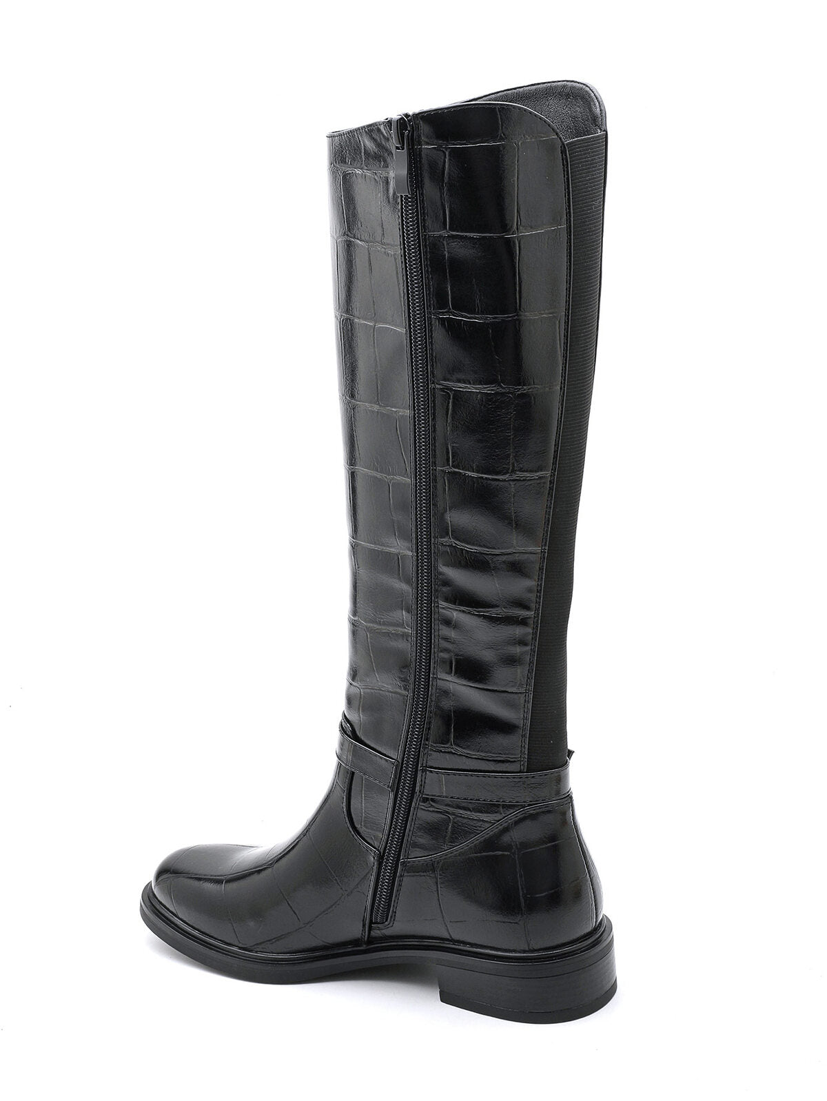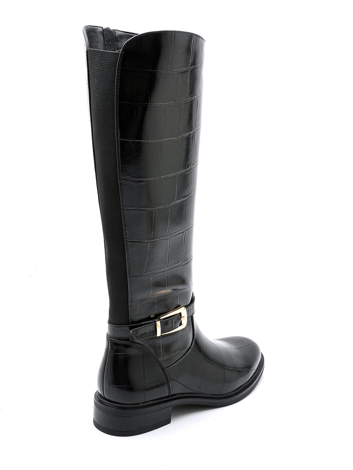 Elegant og stilfuld knæhøj støvle i et flot croco-præget design. Støvlen har en glansfuld overflade, der giver et eksklusivt udtryk, og en smuk guldfarvet spænde ved anklen, som tilføjer et feminint og sofistikeret touch. Perfekt til både hverdag og festlige anledninger.