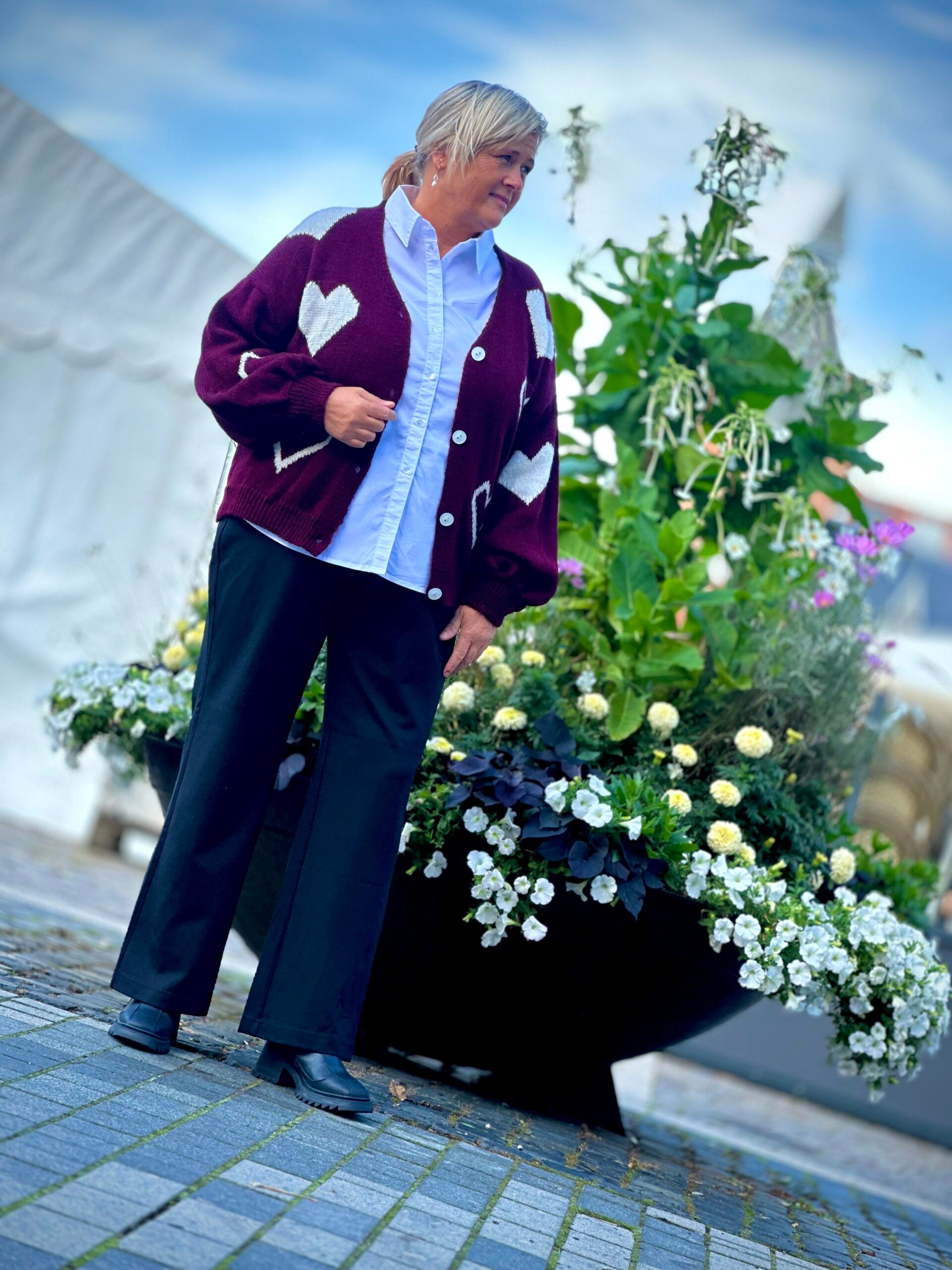 Lun, blød og med et romantisk twist. Den dybe bordeauxfarve giver cardiganen et eksklusivt udtryk, mens de fine hjerter gør den legende og feminin. Vi elsker denne korte cardigan, da en cardigan der kombinerer varme, komfort og farve er perfekt til både hverdagsbrug og sæsonens hyggelige anledninger.