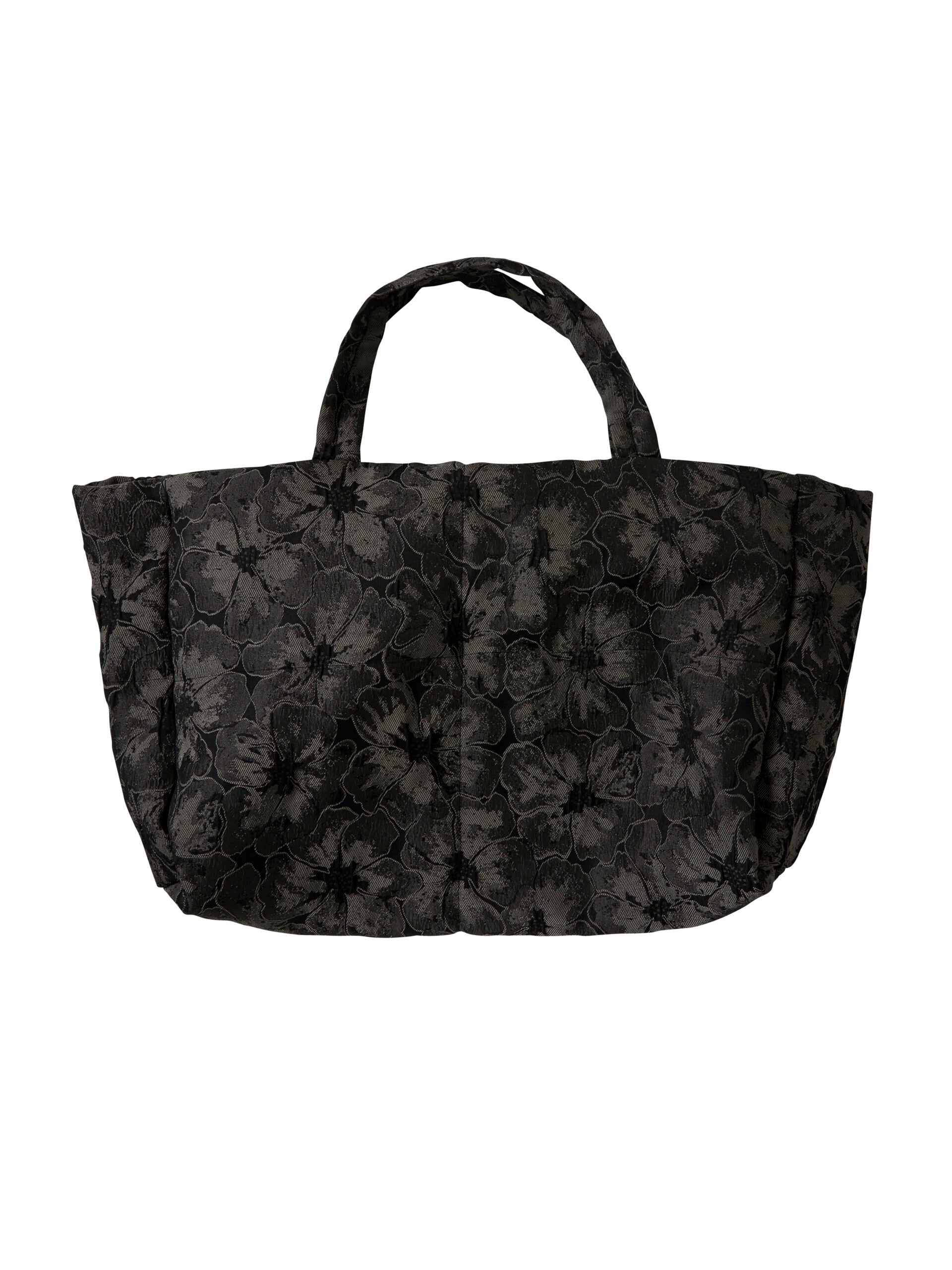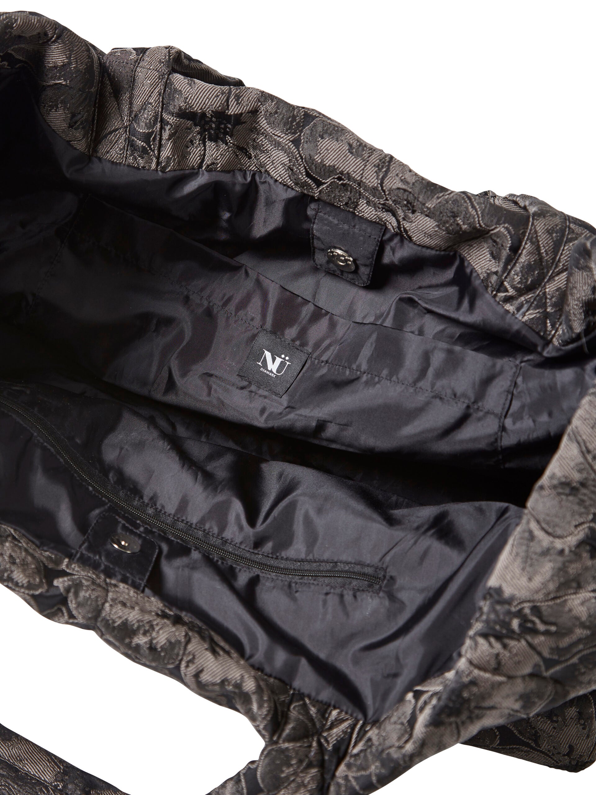 Cool taske fra NÜ med det smukkeste blomstermønster i jaquard. Tasken har to hanke og et stort rum med to små indvendige lommer, det ene med lynlåslukning. Taskens store rum kan lukkes med en trykknap i toppen. Brug tasken til hverdag eller som en weekend taske.