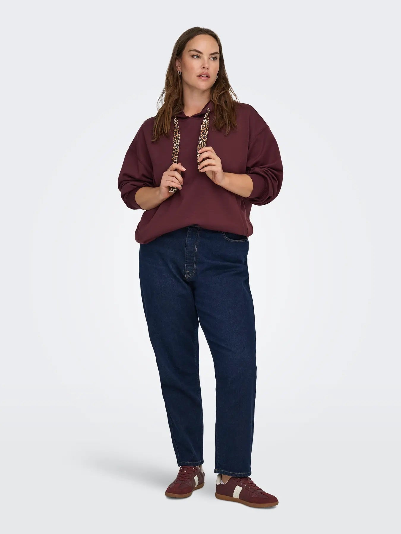 Bliv klar til hverdagen i stil med denne cool hoodie fra ONLY Carmakoma. Den har et afslappet, boxy fit med dropped shoulders, hætte og leopardmønstrede snører, der giver et moderne twist. En perfekt kombination af komfort og trendy detaljer, som passer til både jeans, leggings og nederdele.