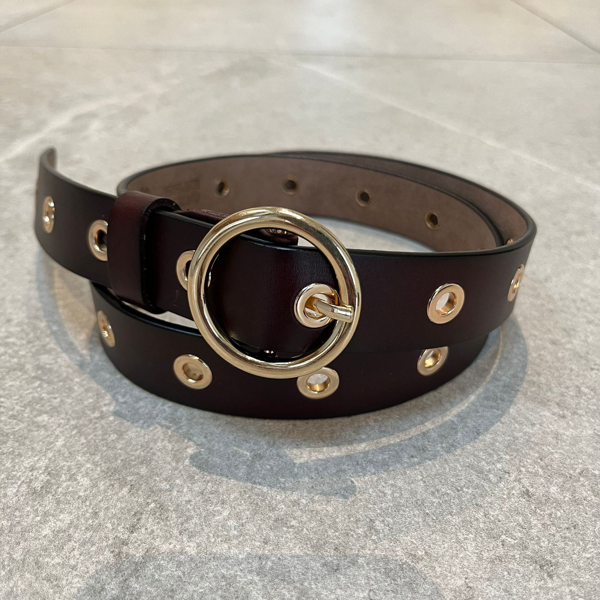 THREE M sort læderbælte med guldhuller – stilrent, råt og tidløst.